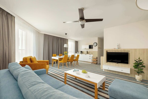Fold-out sofa, TV, table and chairs, exit to balcony