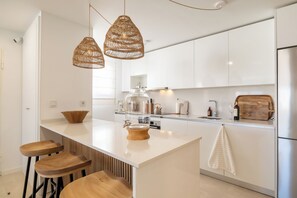 The open-plan kitchen is fully equipped with modern appliances, including an induction hob, a coffee machine, an electric kettle, a microwave, an oven, a dishwasher, a toaster, and a fridge with a freezer. Guests also enjoy access to a shared swimming pool, gym, and sauna.