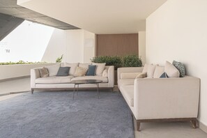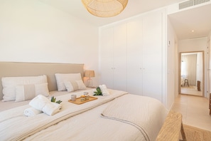Inside, the villa boasts an exquisite and sunlit living room designed for comfort and style. Large glass doors open directly onto the terrace, blurring the lines between indoor and outdoor living. The living room includes a laptop-friendly workspace for remote work or planning day trips.