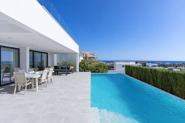 The property has four bedrooms and four bathrooms, plus a large terrace surrounding the private infinity pool—perfect for relaxing and enjoying Mediterranean views.