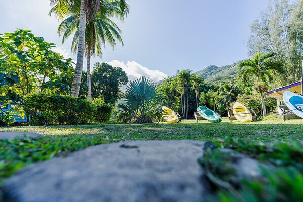 In the serene Garden of Eden, paradise awaits at bottles and stones. Enjoy a tranquil ambiance amidst nature's beauty with kayaks, bikes, and paddleboards readily available to explore Haapiti's world-class surf spot.