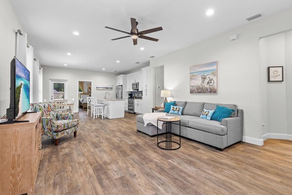 Your perfect home away from home! Fully equipped for your stay. Drop your bikes, kayaks, golf clubs or other recreational toys in the private 2-car garage. Feel the luxury of staying in a new home that was built and furnished for your comfort! It is immaculately maintained with beautiful pristine bathrooms. Although near many restaurants, the kitchen is the heart of the home with granite counters and an open island/breakfast bar. New appliances include a microwave, range with double oven and dishwasher. There is no need to buy water, there is filtered water and ice from the refrigerator. The private fenced-in yard is quiet and backs up to a greenbelt. Step out onto the patio in the mornings and you will enjoy the sounds of nature as the birds are plentiful. Enjoy the fire-pit in our mild but cool winter evenings. Outdoor lighting, BBQ grill and Outdoor seating available to enjoy natural old Florida in this cozy but spacious private backyard. Easy access to beltway that gets you to Orlando or Attractions. For nature lovers, there are beautiful Natural Springs nearby like Wekiva Springs State Park, Kelly Park, Kings Landing and Alexander Springs for Kayaking, Tubing or just cooling off in the springs. Sought after Sydonie Mansion wedding venue only 10 minutes away. Mount Dora Golf Club is around the corner from home. Antiques galore and year-round festivals bring people from all over the country. Live music at different restaurants throughout downtown on weekends. So much to say, so much to do, come to Mount Dora Place and you won't want to leave!