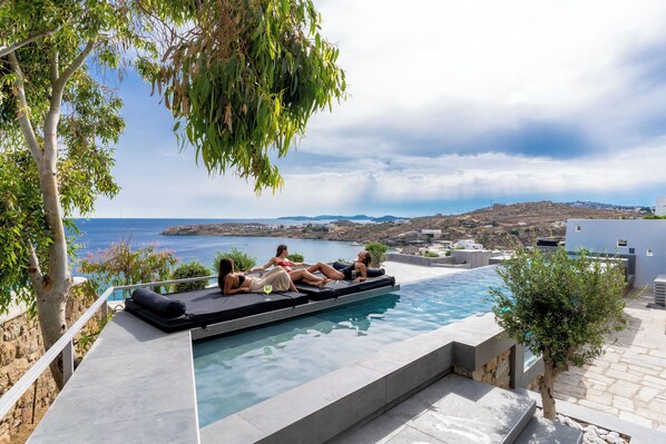 Step into Villa 16, where Cycladic architecture and modern design blend in perfect harmony. Unwind on the spacious X-large private glass pool terrace or lounge by the resort's Infinity Pool. Inside, enjoy a fully-equipped kitchen, comfortable living area with single beds that double as sofas for up to six guests.
