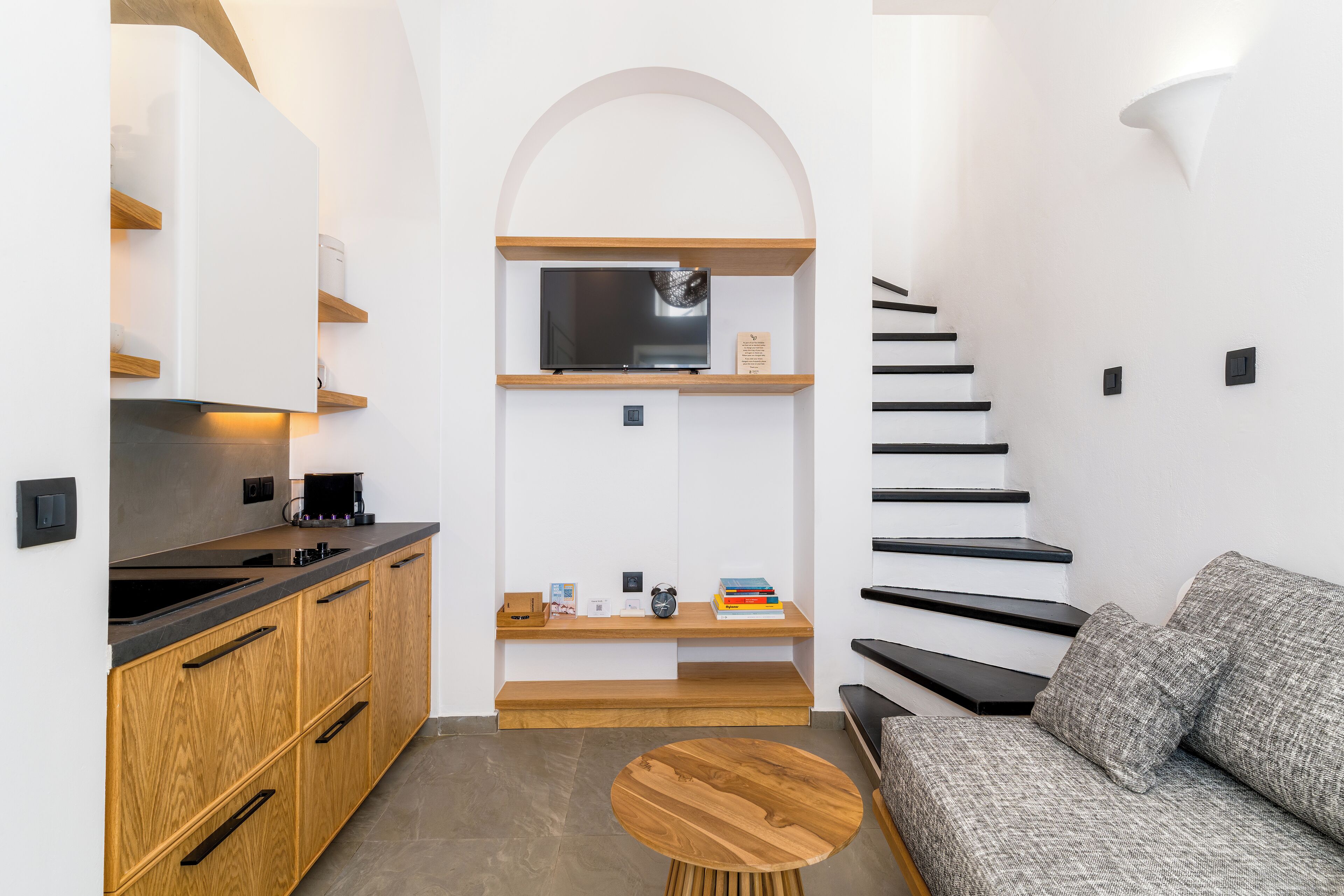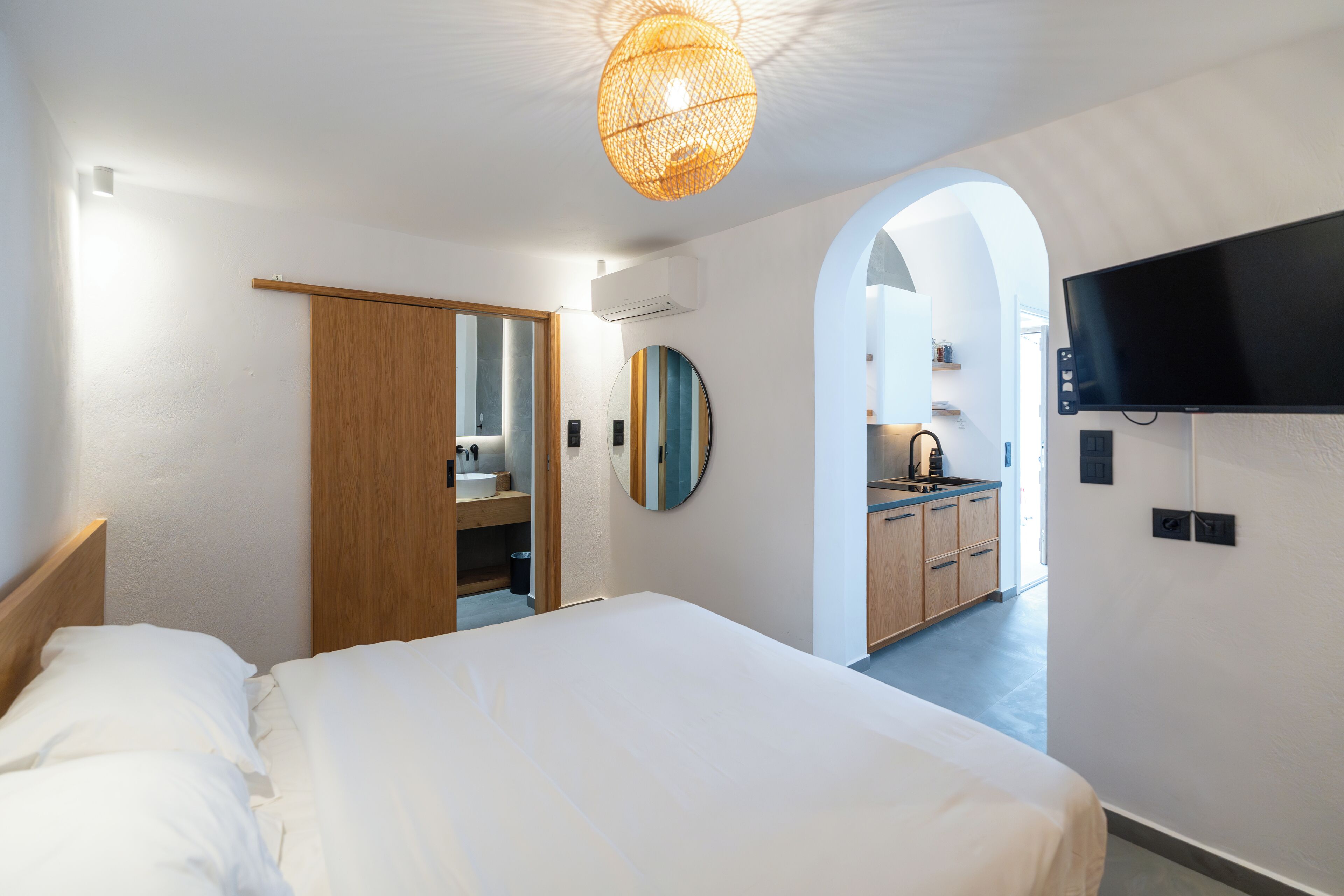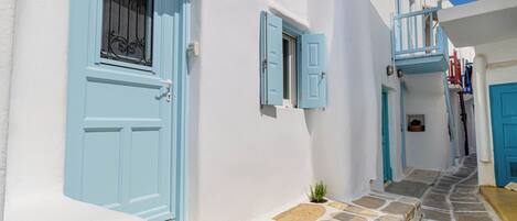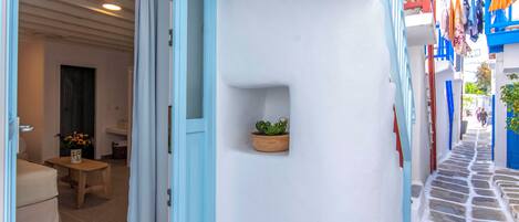 In the heart of Mykonos Town, this Junior Suite with Outdoor Jacuzzi offers a serene retreat for couples. The veranda is equipped with an outdoor jacuzzi and wooden panelling that exudes warmth and coziness.