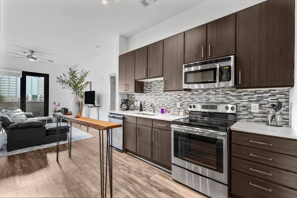 This modern Midtown apartment features an open-concept living space with designer furnishings, Smart TV entertainment, and a fully equipped kitchen perfect for pre-Broadway brunches or late-night snacks. Floor-to-ceiling windows flood the space with Tennessee sunshine, highlighting the contemporary décor and creating an picture-worthy backdrop for your Nashville adventure.