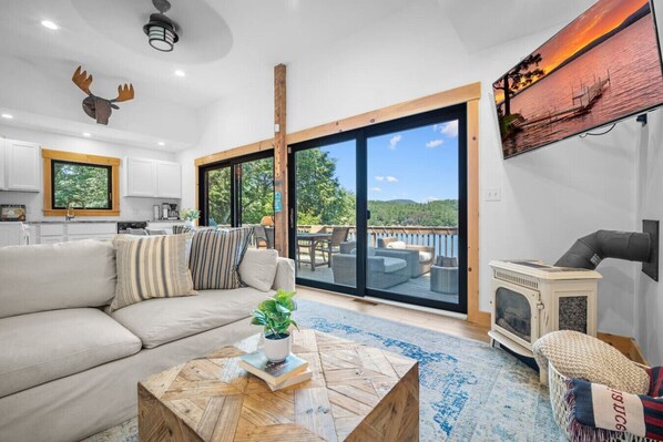 Both of the main level bedrooms have comfortable queen beds and the upstairs bedroom has 2 comfortable queen beds. The living room boasts a spacious sectional with gas fireplace and smart TV with floor to ceiling windows showcasing stunning lake views. Enjoy cooking in the fully stocked kitchen, with the option to dine inside or al fresco.