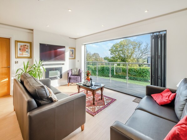 Living area: 50" Freeview Smart TV, Electric Fire, Bi-Fold Doors Leading To Decking