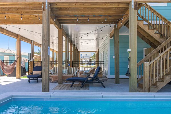 Fantastic Private Heated Pool!! - Dog Friendly; Sleeps 8: 3 Bedrooms (Primary #1 - King with EnSuite; #2 King; #3 Queen & Twin Bunkbed; Shared Hall Bath); 2 desks for Mobile Working/School; Wireless Printer; Large Assortment of Small Kitchen Appliances; Outdoor Shower (hot/cold) with Dog Sprayer; 2 Welcoming Porches; Ocean view; 2 blocks from the Beach; 2 Under the Cottage Parking Areas & additional parking on the concrete driveway; Lots of Windows for Natural Light; Large Charcoal Grill; Picnic Table; Lots of Games; Fenced-In Backyard; Dog Beds, Bowls, Gate, Sofa Pet Covers; Beach Chairs, Umbrellas, Beach Cart. Whole home water filtration system for better tasting water and smoother feeling showers!
