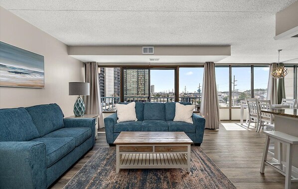 The unit features laminate flooring and is nicely furnished throughout. The kitchen has granite countertops and stainless-steel appliances and is ready to make those cost saving meals at home. There is huge flat screen TV in the living room along with flat screen TV's in both bedrooms. There is a washer/dryer in the unit and Wi-Fi is available for those of you who must "stay connected" while you are away.
