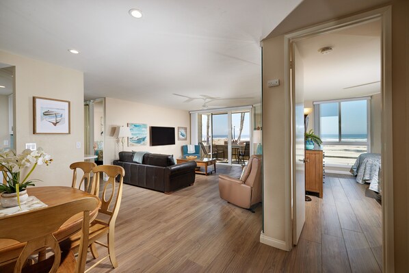 Experience breathtaking panoramic whitewater ocean views! This front-row, west-facing beach condo is on the ground floor and has just undergone a completely gorgeous remodel! Wood-look tile throughout, new kitchen with quartz counters, new shaker cabinets, aqua tile backsplash, stainless appliances and a Kohler Workstation sink. All new bathrooms feature porcelain wall tile with designer trim and backsplashes. Soothing ocean colors create a luxurious, relaxing retreat with 2 leather recliners, a queen-size sofa bed, and an additional chair. The living room features a cozy gas fireplace, and opens to the oceanfront patio.