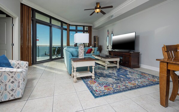 High above the sugar-white sand on the 29th floor of The Oasis at Orange Beach, all you’ll see is blue skies and emerald waves through the floor-to-ceiling windows and sliders in this coastal charmer. After days filled with pool and beach time, there’s nothing sweeter than unwinding in the open living room, gathering on the beachy blue sectional, and watching a movie on the flatscreen TV.