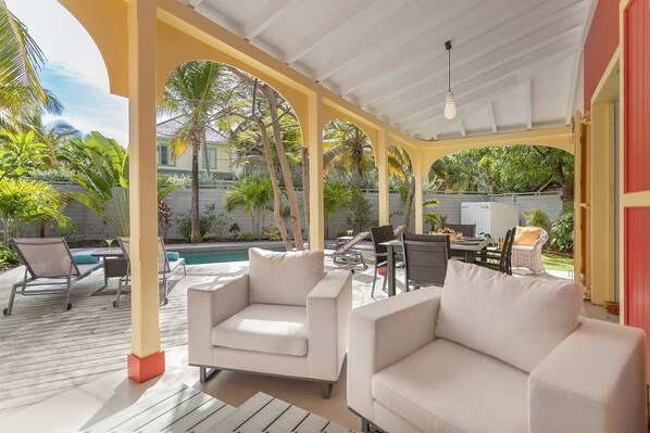 Step outside to your private pool surrounded by sun loungers, perfect for soaking up the Caribbean sunshine. The spacious terrace, with its dining and lounge areas, invites you to enjoy convivial meals and unforgettable moments with family or friends.