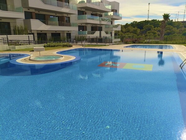 Beachfront apartment with an outdoor pool and a hot tub