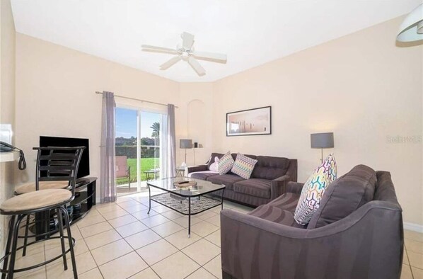 Your stay includes all the free resort style amenities - NO EXTRA FEES required. The resort includes stunning pools, water slides, a hot tub, tennis court (bring your rackets!), a clubhouse with a fitness center, business center, on-site market, restaurant, concierge, and more less than a 1 minute walk from your front door. The restaurant will even deliver to the home!