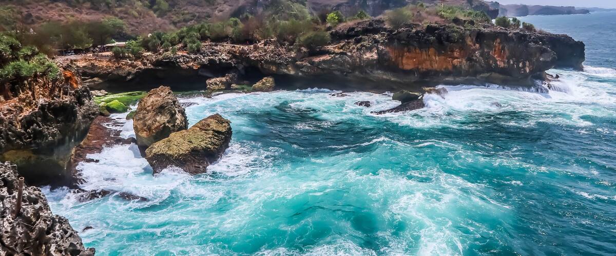 Surfers flock to Klayar Beach for dramatic waves crashing against unique rock formations that create whistling sounds at low tide. Explore limestone caves at Gong Cave where massive stalactites hang above illuminated underground pools and ancient rock formations.