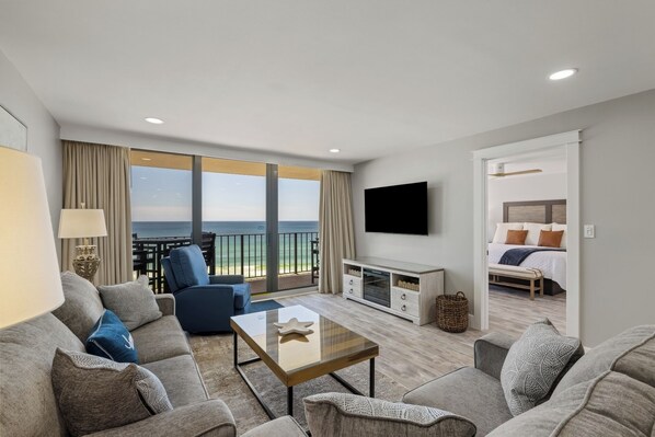 C-Breeze's living room offers comfy seating, a smart TV, and access to the private balcony. The kitchen and dining area are adjacent and offer all you need for meals and snacks along with seating for up to nine people. A washer and dryer plus free, high speed internet are available for guest convenience.