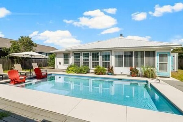 Private Saltwater Pool! LUX Vibe! Dogs Ok! Golf Cart! 3 Mins To Beach! Sleeps 9!