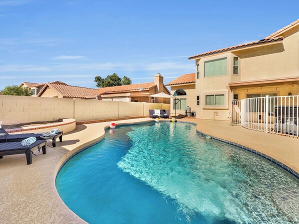 Splash. Thinking of booking October 15-April 15? The weather in Arizona can be quite volatile this time of year. There may be soaring temperatures over 100 degrees or temperatures that can drop below 50 degrees. This home is equipped with a heat pump, reel, and cover. The heat pump that is responsible for heating the pool is at full efficiency if the weather stays above 50 degrees, allowing the pool to get to a comfortable swimming temperature of 85 degrees. Should you want the pool heated, please book with that option now. As your reservation date approaches, should you find the temps heading below 50 degrees, you can make a final decision if you wish the pool to be heated based on weather conditions. We can refund the pool heat fees should you be concerned about not being able to enjoy this amenity as intended.