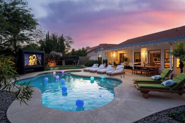 Escape to a private oasis at this modern Tuscan-style retreat, where sun-filled rooms and a fully equipped kitchen await. Unwind in the resort-style yard with a pool, lounge, BBQ, ping pong table and mini golf course or relax by the fireplace in one of two spacious living areas.