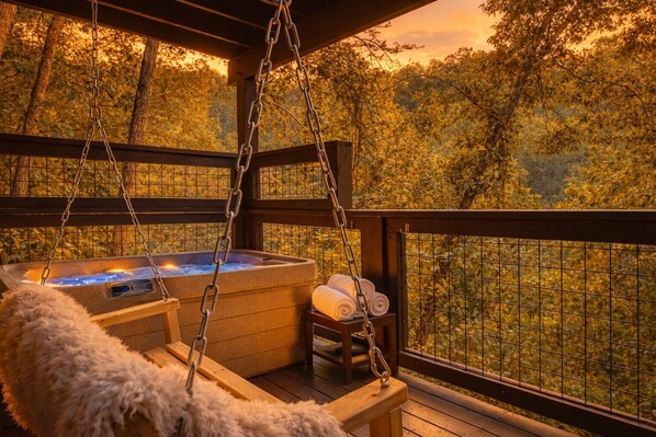 • Extended lower deck with hot tub and porch swing