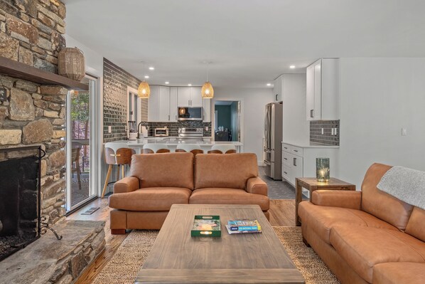 Step inside to an airy, open-concept living space with a fully equipped kitchen, gas fireplace, cozy furnishings, and curated design details that strike the perfect balance between comfort and style. The primary bedroom at Pisgah Cottage offers a king-sized bed, sitting area, and ensuite bathroom with dual sinks and a large shower. Bedroom 2 is also home to a king-sized bed and shares the hall bathroom with Bedroom 3, complete with a queen-sized bed. The hall bathroom also offers dual sinks and a large shower. The 4th bedroom is home to 3 twin-sized beds, great for everyone, especially the smallest travelers in your group! A third full bathroom with another shower is located just off the kitchen.