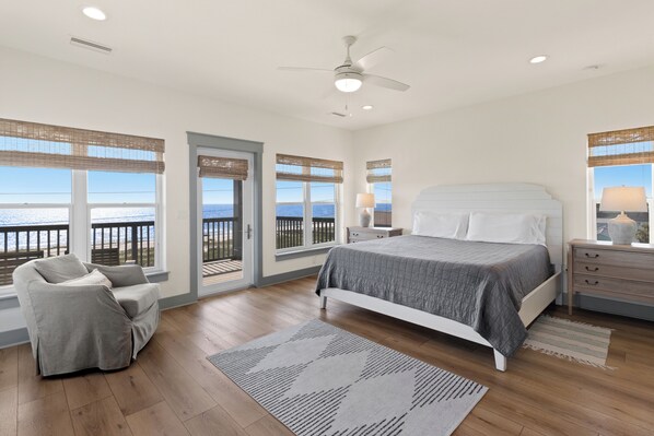 First master bedroom with king-size bed, smart TV, access to private balcony, bathroom with custom tile shower