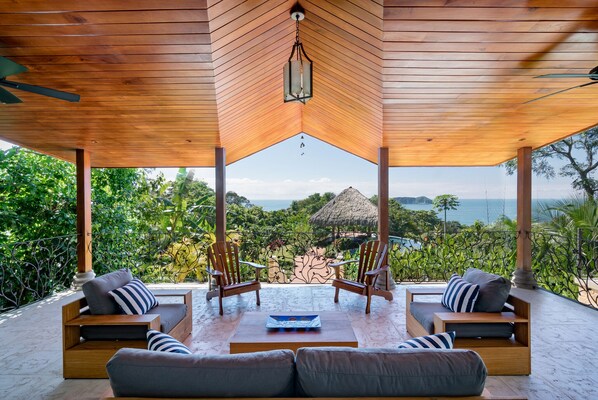 The spacious kitchen and indoor living room look out over the roar of the ocean directly at Elephant Rock. The enormous outdoor patio is both under roof and under open sky, so sun worshippers and shade worshippers both share a perfect world. As visitor, you will feel you are part of the jungle as well as part of the ocean panaroma with views of the Manuel Antonio Park. This 3 story house has the cozy comfort of a moderate sized structure but the expansive capacity of a full six bedroom structure. There is safety and privacy for those that wisely seek such comforts.