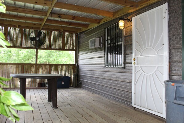 Cabin is cute, has 2 tvs but you can’t pick up anything, asked the owner through text where the tv remote was they responded “not sure” fridge temp was at 46-56, freezer finally got down to 15, so we had to store items in the freezer. Air conditioning was great once we turned it on, bed was comfortable and has nice bathroom. Outside enclosed patio looked like it hadn’t been cleaned since last summer. Loose dogs running around that don’t appear to be friendly, so you had to be careful walking.