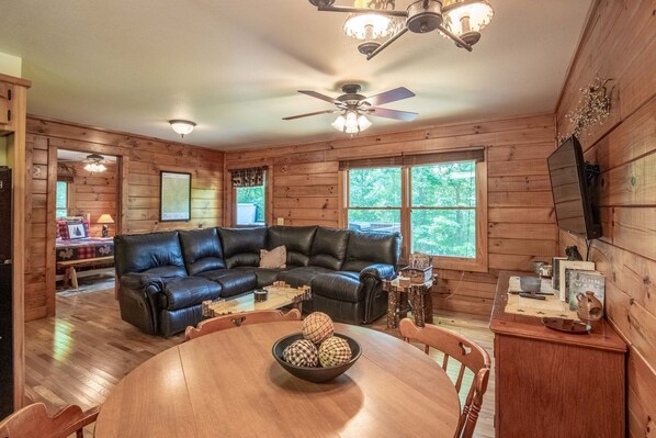 Welcome to Ledbetter Trails, a serene getaway designed to showcase the picturesque walking paths that meander across nearly eight acres of pristine woodland. This cabin provides an exceptional level of privacy and seclusion, enveloped by a lush, heavily wooded environment. The well-maintained trails invite you to leisurely explore the natural beauty surrounding you, culminating at a charming private pond where you can observe local wildlife and feed the fish. (Please note that swimming is not permitted.) Families with children will appreciate the opportunity for a first fishing experience—no license required, as this is a private pond.