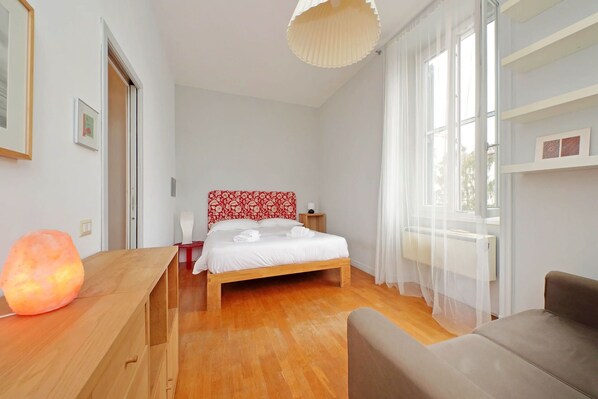 The two bedrooms entering on the left have a double bed (140cm x 190cm), desks, bookcase, wardrobe, chair and armchair. The bedroom on the right has a double bed (140cm x 190cm), desk, wardrobe, chair and bookcase. NB. this bedroom has scaffolding in front of the window due to the refurbishing of the facade of the building and is therefore advisable not to open the shutters.