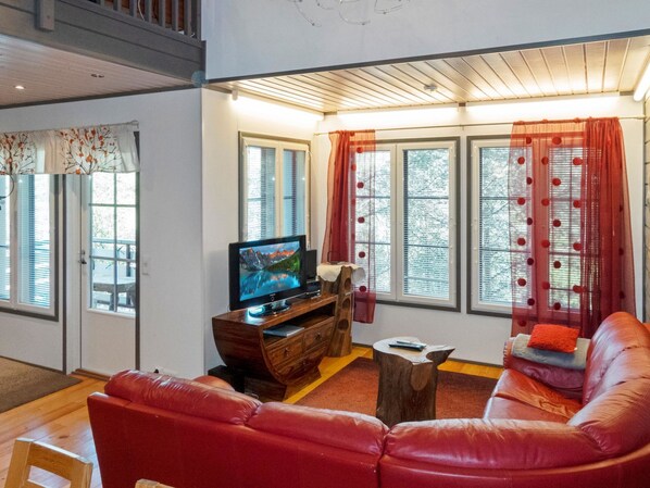 On the mezzanine floor there is living area with double bed (width 140 cm) in its own compartment and spreadable sofa bed. In connection with the loft there is also balcony. On the ground floor of the apartment, garage for snowmobile. This space is suitable for storing equipment and ski maintenance, for example. Lifting door in the garage.