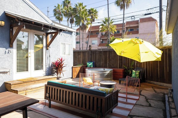 • Backyard Paradise: Gated private yard with heated stock tank pool, multiple lounge areas, dining space, BBQ grill, and working fire pit (round black style—square table pit is decorative)