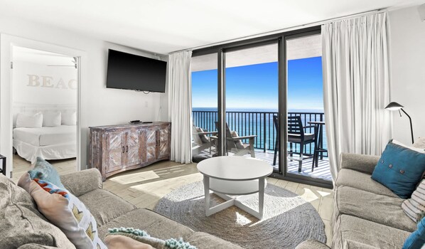 • Private Balcony: Enjoy panoramic 180-degree Gulf views from the balcony, furnished with teak lounge chairs and a dining set for four.