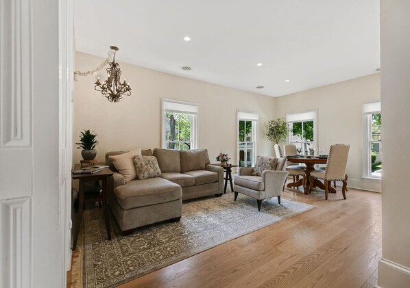 The second-floor apartment features a wonderful porch with rocking chairs, two bedrooms; two full bathrooms, both complete with walk-in closets; a study complete with a desk, sofa, and wide-screen TV; a cozy living room space with a large TV; dining nook with seating for 4; a full kitchen with all new appliances including a Keurig and French press. All furniture, bedding, towels, appliances, and accessories have been purchased new in the past 6 months. A professional cleaning service thoroughly cleans the home following our detailed instructions to ensure the space is pristine for your visit.
