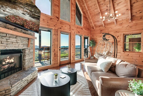 Inside, the all-wood interior and soaring ceilings create a warm, cozy atmosphere. Rich textures, thoughtful touches, and four fireplaces throughout the cabin set the stage for unforgettable moments together.