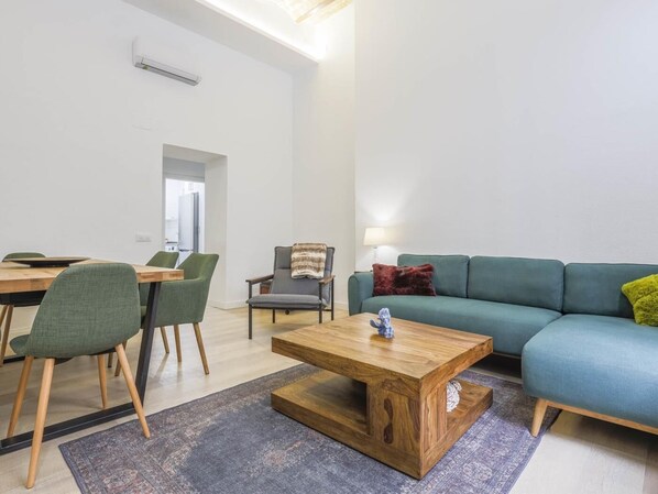 It has air conditioning, Wifi, a large TV, Netflix for the use of our guests.It has an injectable bed in the living room which makes it ideal for 2 people but also now for up to 4 if traveling with a child or 2 couples.Keep in mind that when the injected bed in the living room is installed, access to the living room is blocked for the use of the people who are using said bed. However, both the kitchen and the bathroom are perfectly accessible.