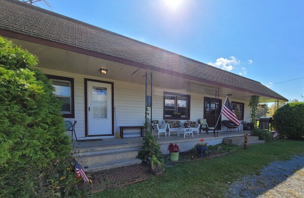 This 3000 sq ft home is located in the middle of the Cherokee National Forest and views the ridge of the Appalachian Trail from the front porch. Located in the middle of this small town of just under 1000 population, offers a country store and a Dollar General both within view and walking distance from the home. Amazing views of the mountains completely surround the home which offers a large flat yard for activities. Including a fire pit area - umbrella tables and chairs - Gaming net - Horse shoes pits, etc. A total of 73 Private bedrooms each with Queen beds, Semi private sleeping room for 6 with 1 queen size bed, and 2 full size, and 1 mobile cot. This room is adjacent to the second living room which has a TV with Roku and DVD.
