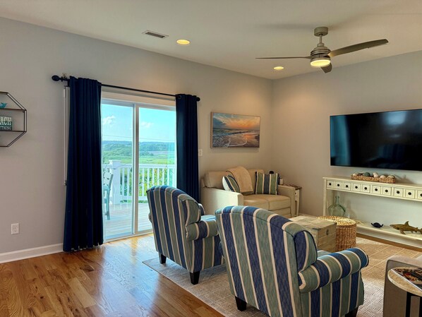 Living room with plentiful seating, smart TV