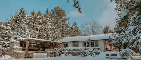 Escape to a serene retreat at Lake Lovering, where Hébergia invites you to unwind in an open concept chalet. Take in the lovely lake view from the covered balcony or enjoy water sports on the private dock. The outdoor spa, fireplace, and BBQ area with patio furniture await your relaxation.