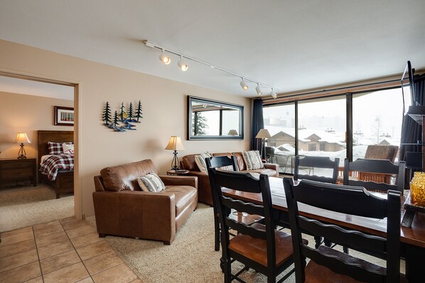 Easy ski in, short walk down 2 sets of stairs outside to get to Christie III lift. Really liked that the second bedroom was big and spacious with bathroom for 3 kids. So many 2nd bedrooms are twin beds or one queen...2 queen beds was nice!
