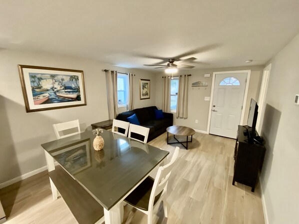 Escape to On Deck, your ideal beachside retreat located just four short blocks from the sandy shores. This newly renovated, pet-friendly vacation rental is perfect for families and groups, offering two identical floors that can be rented separately or together for a spacious experience.