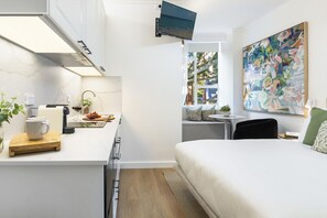The studio is tastefully furnished with quality finishes and features warm timber floorboards, a built-in wardrobe for storage, and a convenient kitchen equipped with the essentials to prepare light meals.