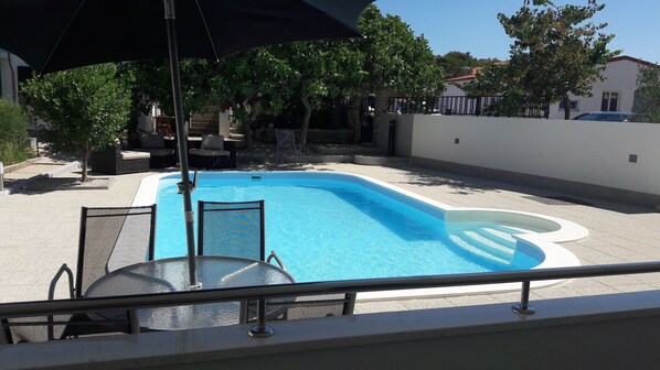 Located on the ground floor, this room offers a comfortable retreat with a king size bed and single bed. The house features an outdoor pool and AC unit for warm days, plus parking cards that grant access to designated parking areas in Jezera, Tisno and Betina.