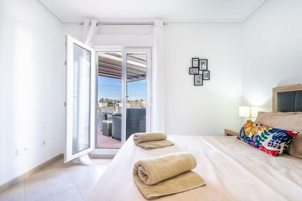This modern second-floor apartment offers bright and spacious accommodation with spectacular views over the golf course. The apartment has two bedrooms, accommodating up to four people. The first bedroom features a double bed, while the second bedroom has two single beds. Both bedrooms are equipped with ceiling fans to ensure your comfort.