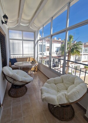Light 2 bedroom apartment with a balcony terrace and pool view, 10 minutes from Punta Prima beach.