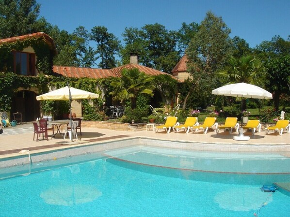 Your summer holiday rental destination is a complex of two villas and a small chalet, which combined accommodate up to 12 guests (we can add some cods for small kids easily), located in Gascogne, a beautiful area of France. In spring you have a magnificent view of the Pyrenees. The large (11x12 m) endless pool will give you great enjoyment during our warm and sunny summers. The pool has its own large terrace, with deckchairs. Large parasols will give you the choice of shade or sun. Both villas are well furnished with each their individual characteristics. Each villa has their own well located terrace to enjoy your lazy breakfast in the sun or the shade, provided by lovely trees around the villas. The patio at the main villa is the place where to meet for morning coffee. It makes for a diffiult choice, where to enjoy your glass of wine or have the afternoon barbecue. The villas are surrounded by your own private park on the gentle south slope, overlooking the Jazz village of Marciac. Rental rates are for the entire complex combined, so privacy is guaranteed!