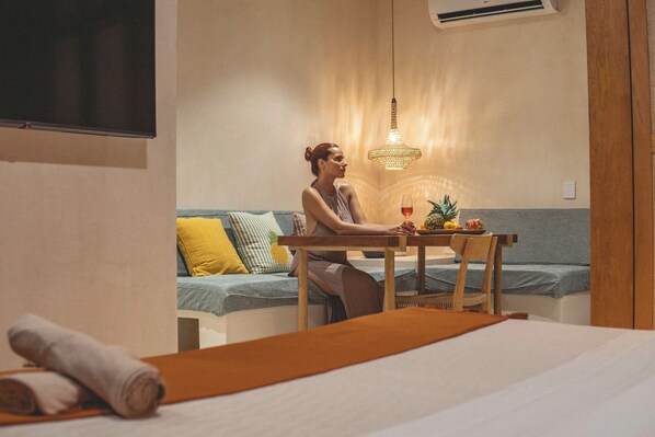 The loft features a comfortable sleeping area with a plush king-sized bed and ample storage space to keep your belongings organized. Step outside through the sliding glass doors and enjoy your private terrace with a perfect spot for morning coffee or evening relaxation.