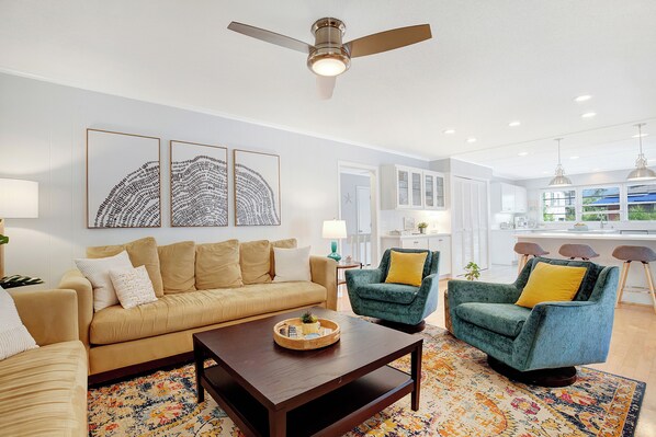 Living room with smart TV and seating; connects to the kitchen, opens to screened porch