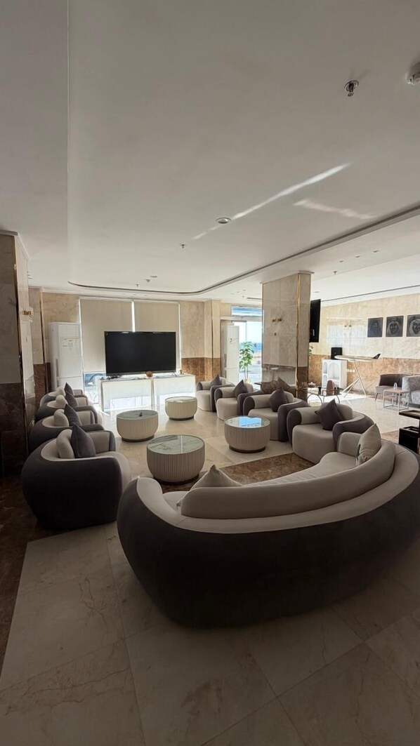 A reception hall, a 24-hour front desk, and a TV in the lobby