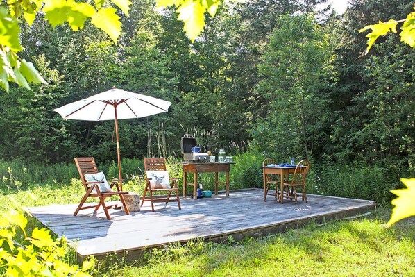The Boho Bell Tent is nestled in the secluded forest of our 10-acre paradise making it incredibly private. Your private deck is at the entrance to the forest where you can spend the day dining in the sunshine and reading in the hammock. Your kitchenette has all the essentials for making a meal on your own private grill, fresh spring water is provided.